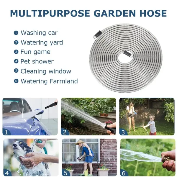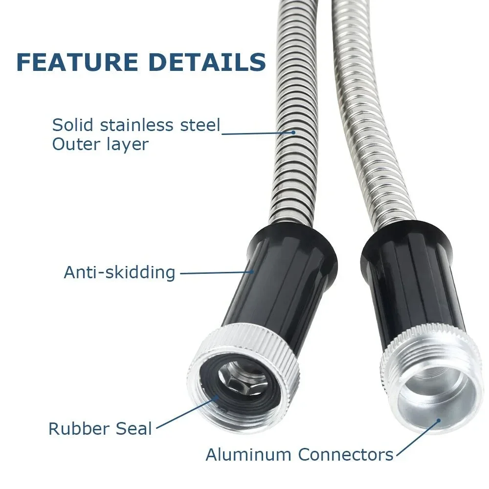 - METALEN TUINSLANG 7,6 M - Gemaakt van hoogwaardig, robuust roestvrij staal 304, dus breekt niet onder druk. Het metalen ontwerp garandeert flexibiliteit, soepele werking, duurzaamheid en een langere levensduur van de roestvrijstalen metalen waterslang!
